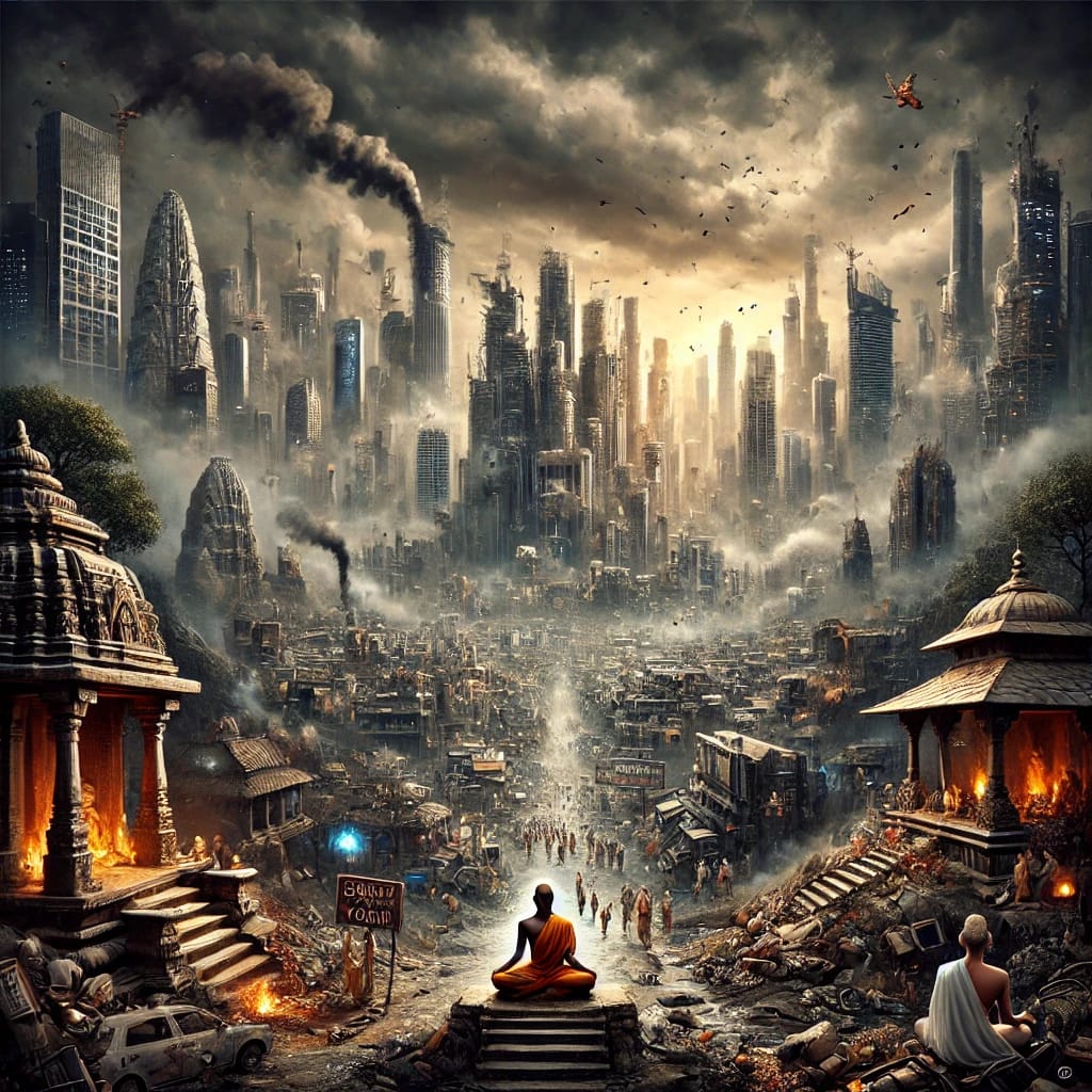 The current age of darkness and moral decline, where dharma is at its lowest, corruption and ignorance prevail, and spirituality is often overshadowed by materialism.